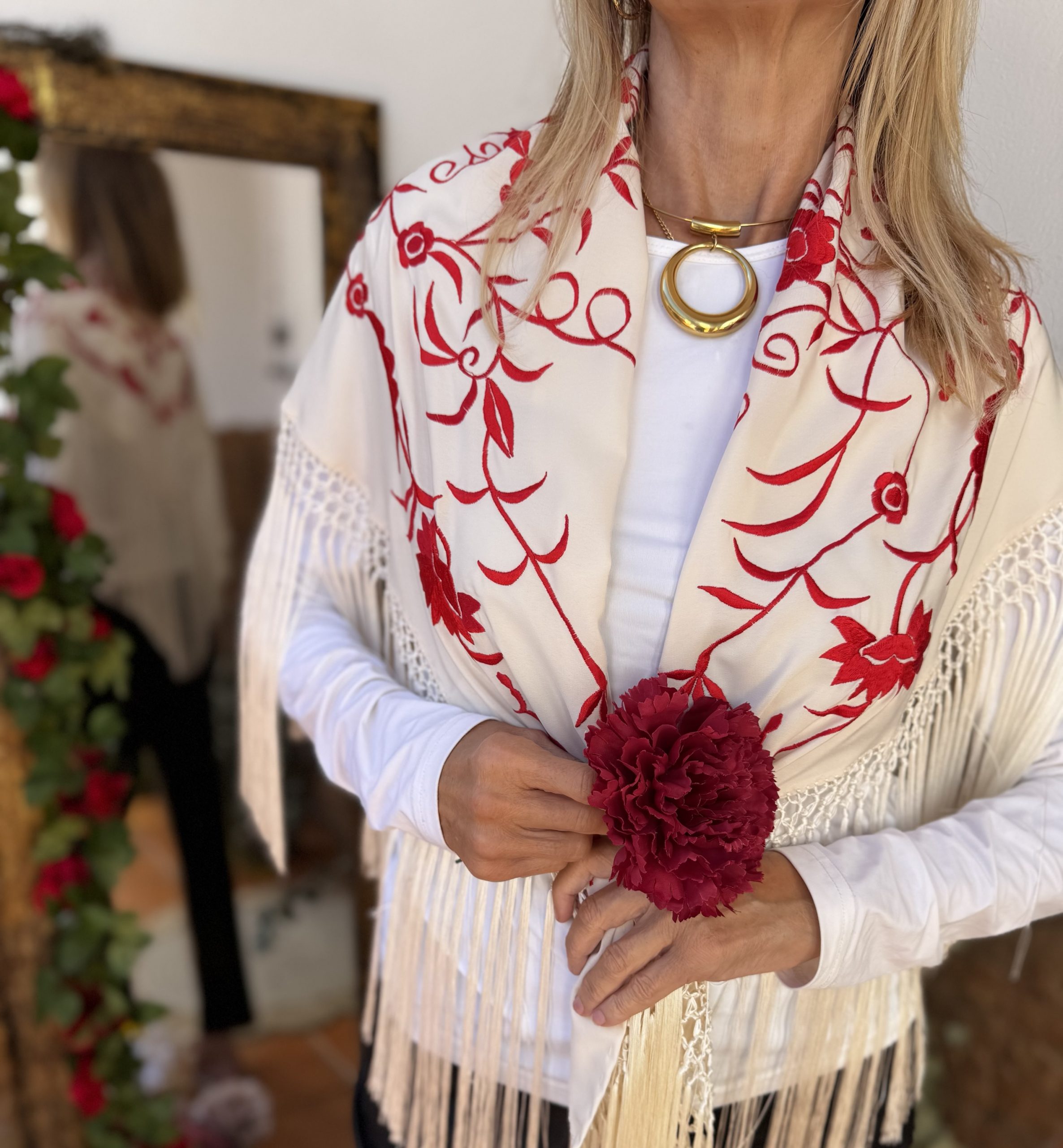 Es una opción perfecta para tener un cuadro de mantón y al mismo tiempo un mantoncillo bordado por un lado en negro monocolor y por el otro en negro y beige.