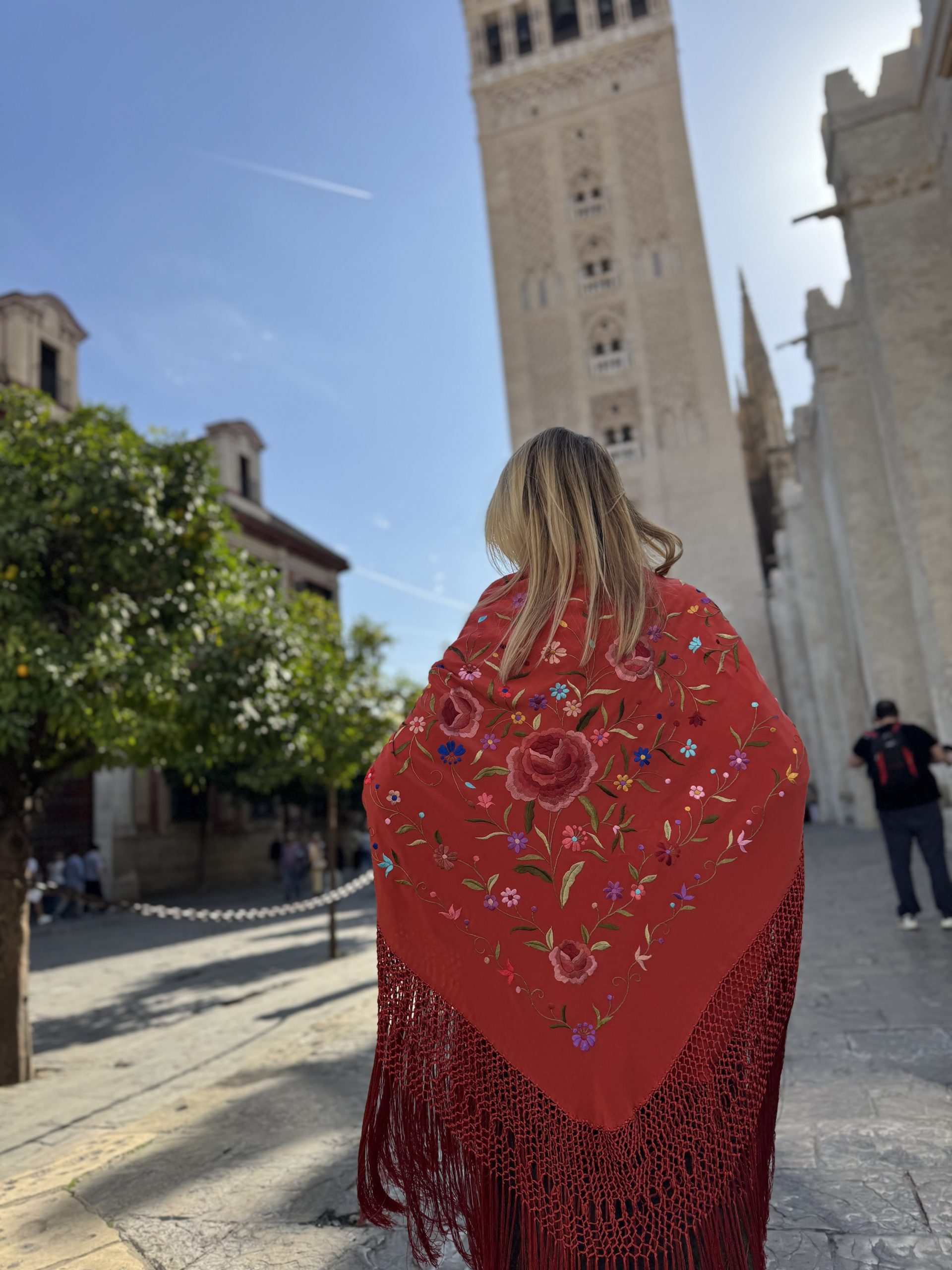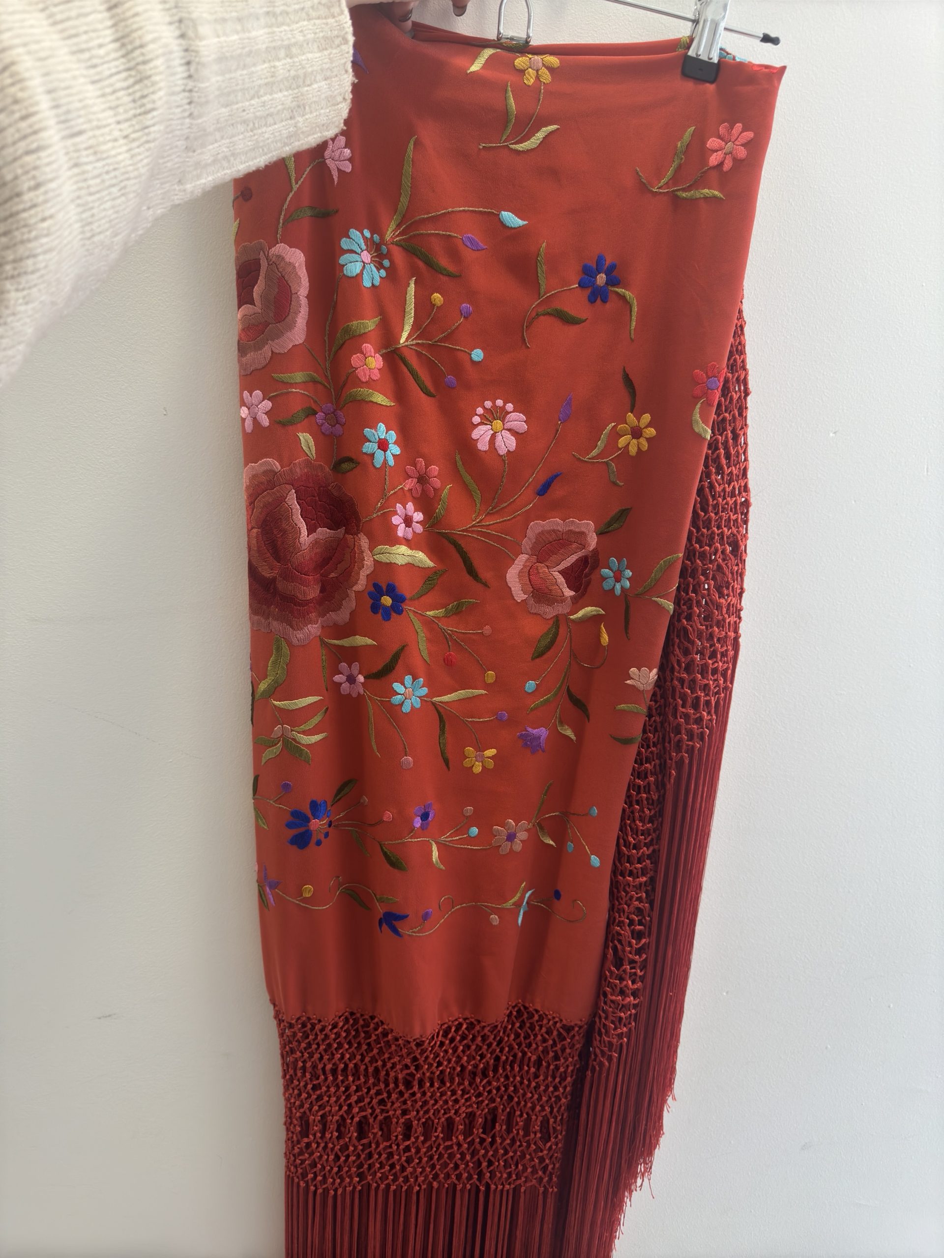 Cuadro de mantón de manila de 1,40 x 1,40 cms aprox en tejido de Batista de seda bordado a mano en colores.