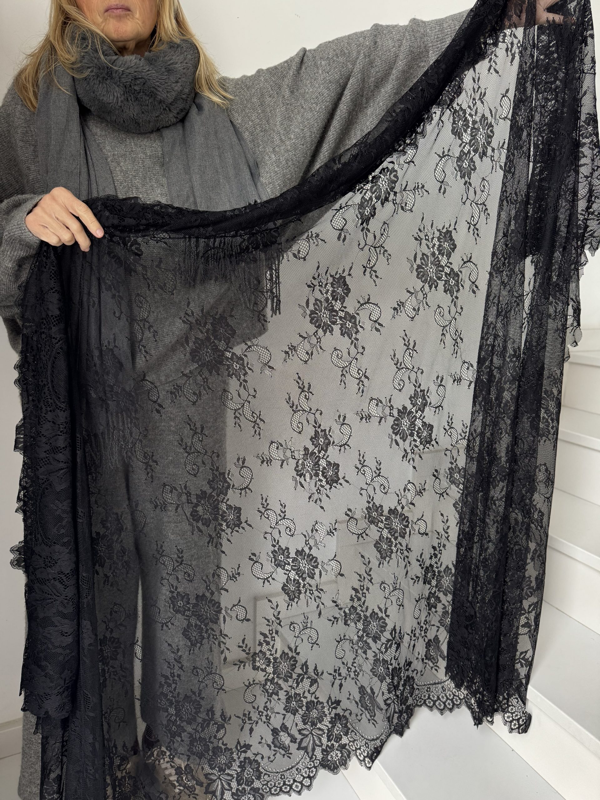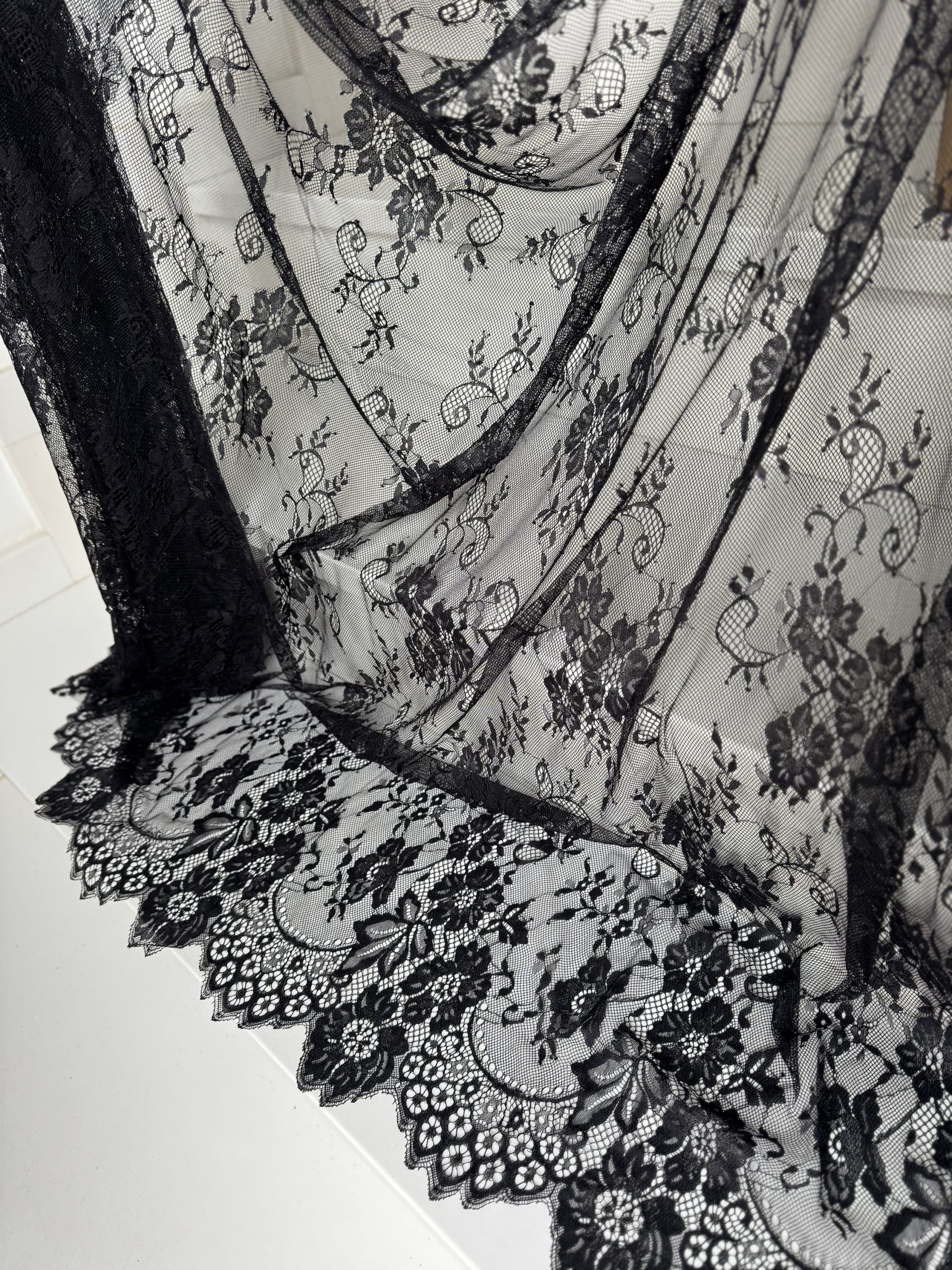 Mantilla negra bordada a máquina de dos hilos con ojetes.
