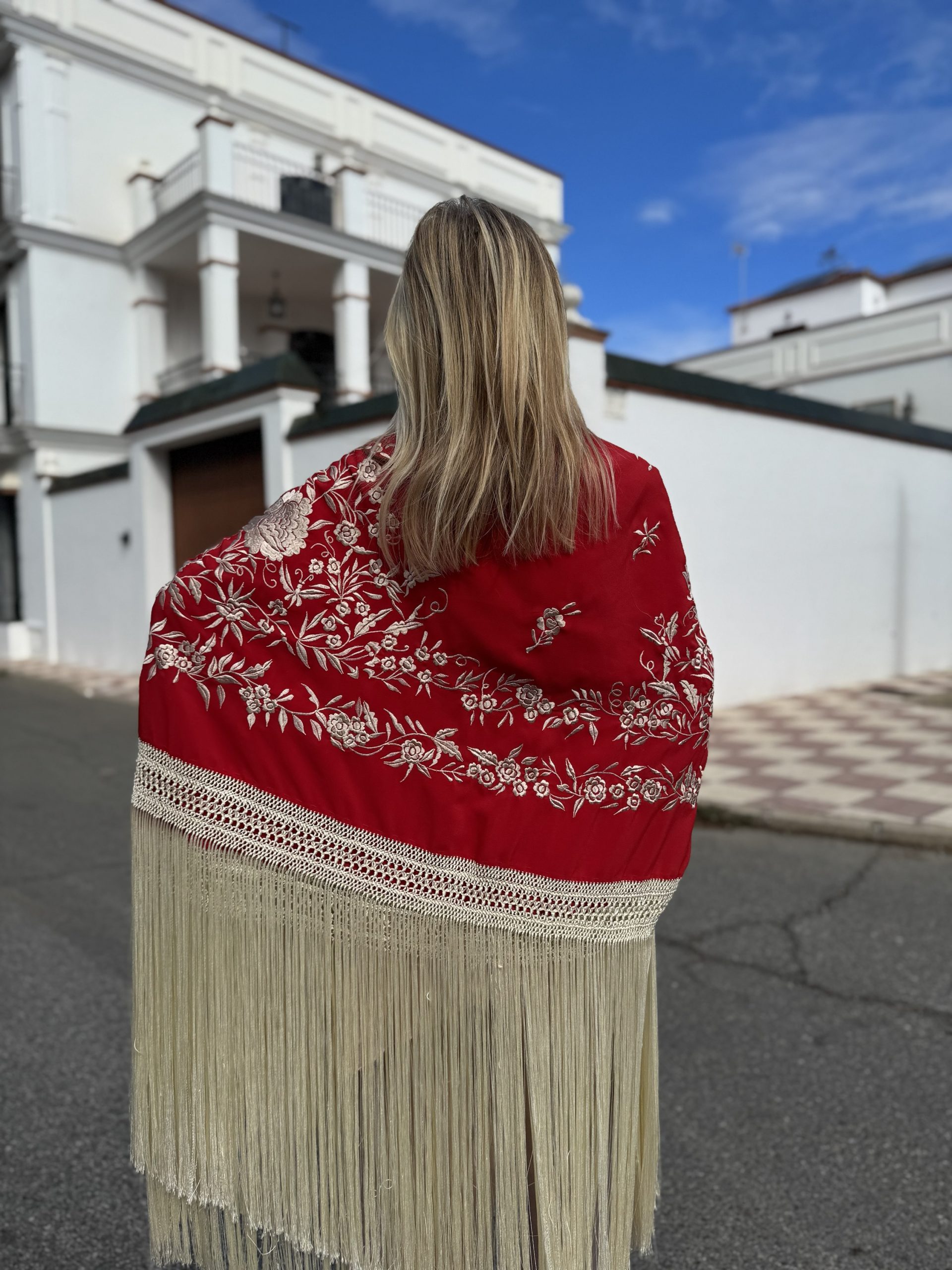 Cuadro de mantón de manila rojo valentino bordado en beige. Flecos mismo color del bordado.