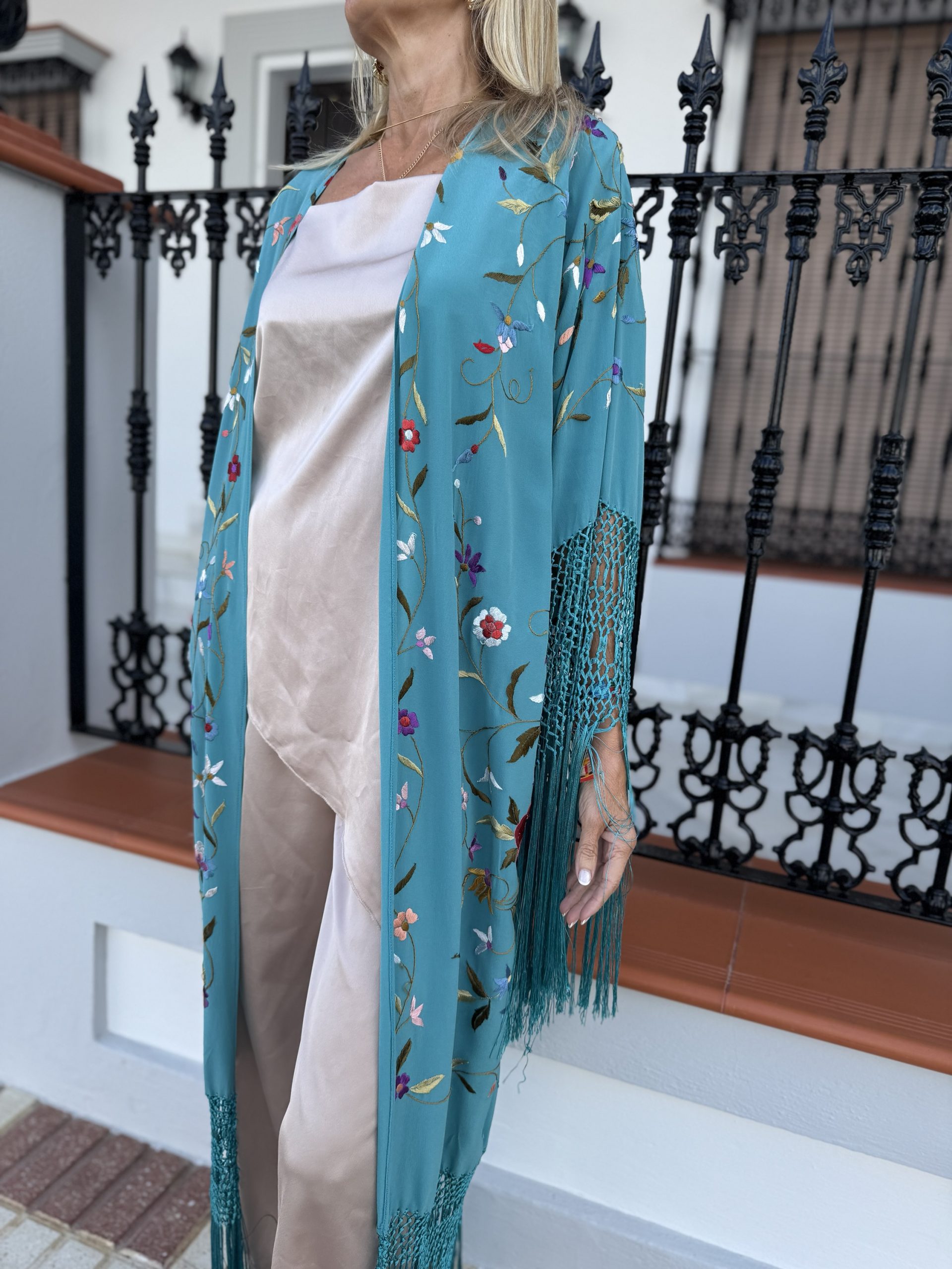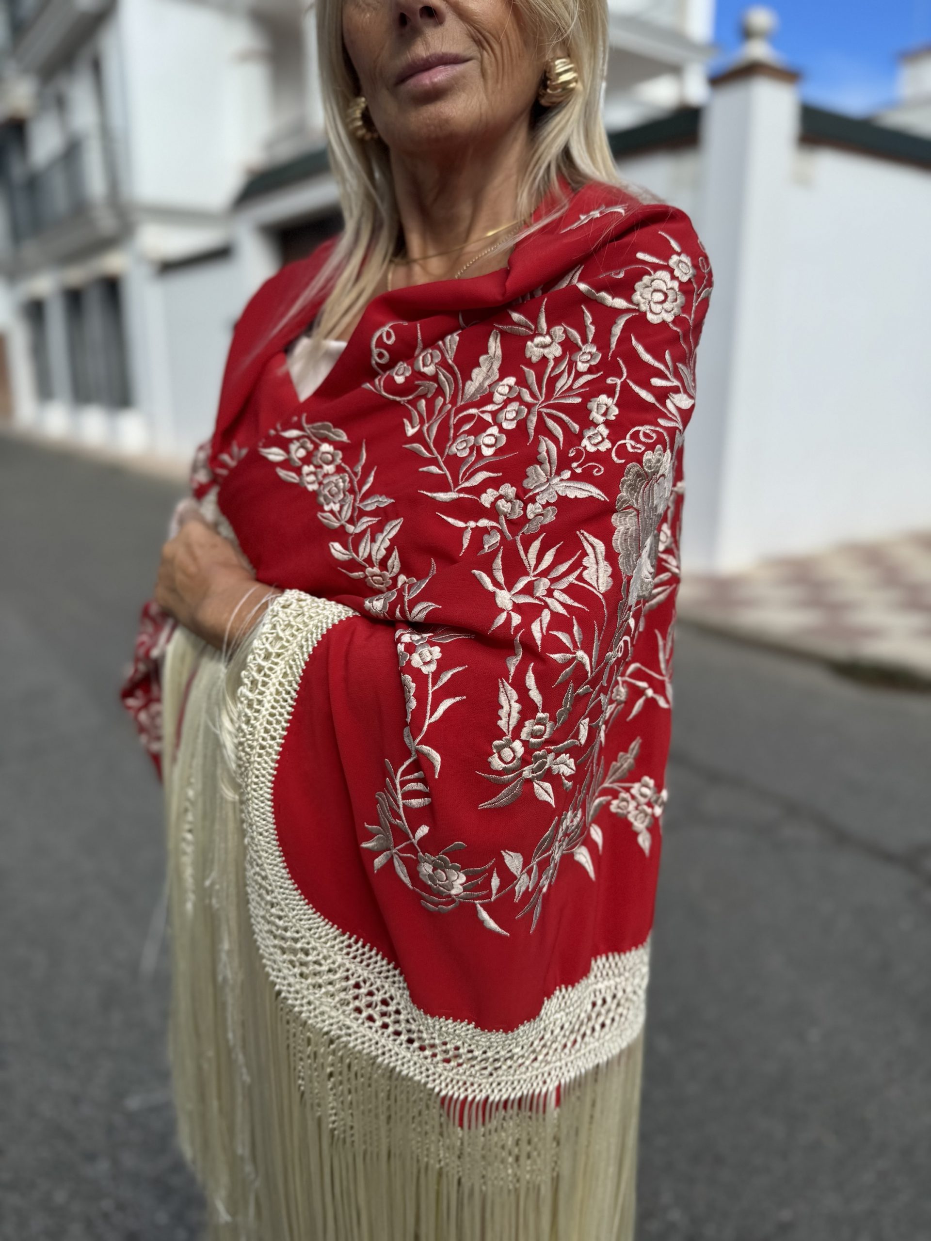 Cuadro de mantón de manila en color rosa maquillaje bordada en un rebaje de tonos empolvados con la técnica de bordado del pisado.