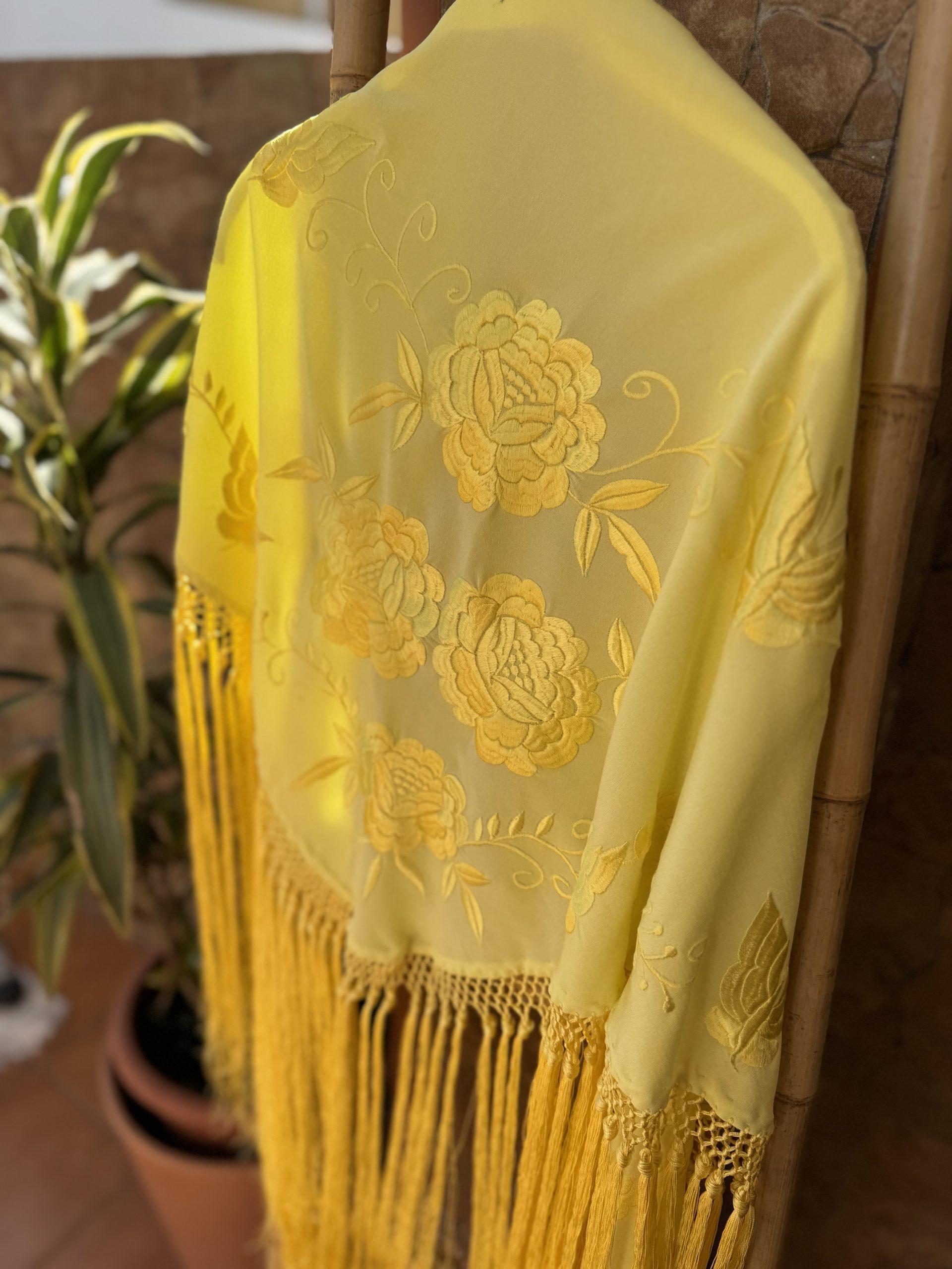 Mantón en tejido de crespón de seda en color lima monocolor con bordado artesanal.