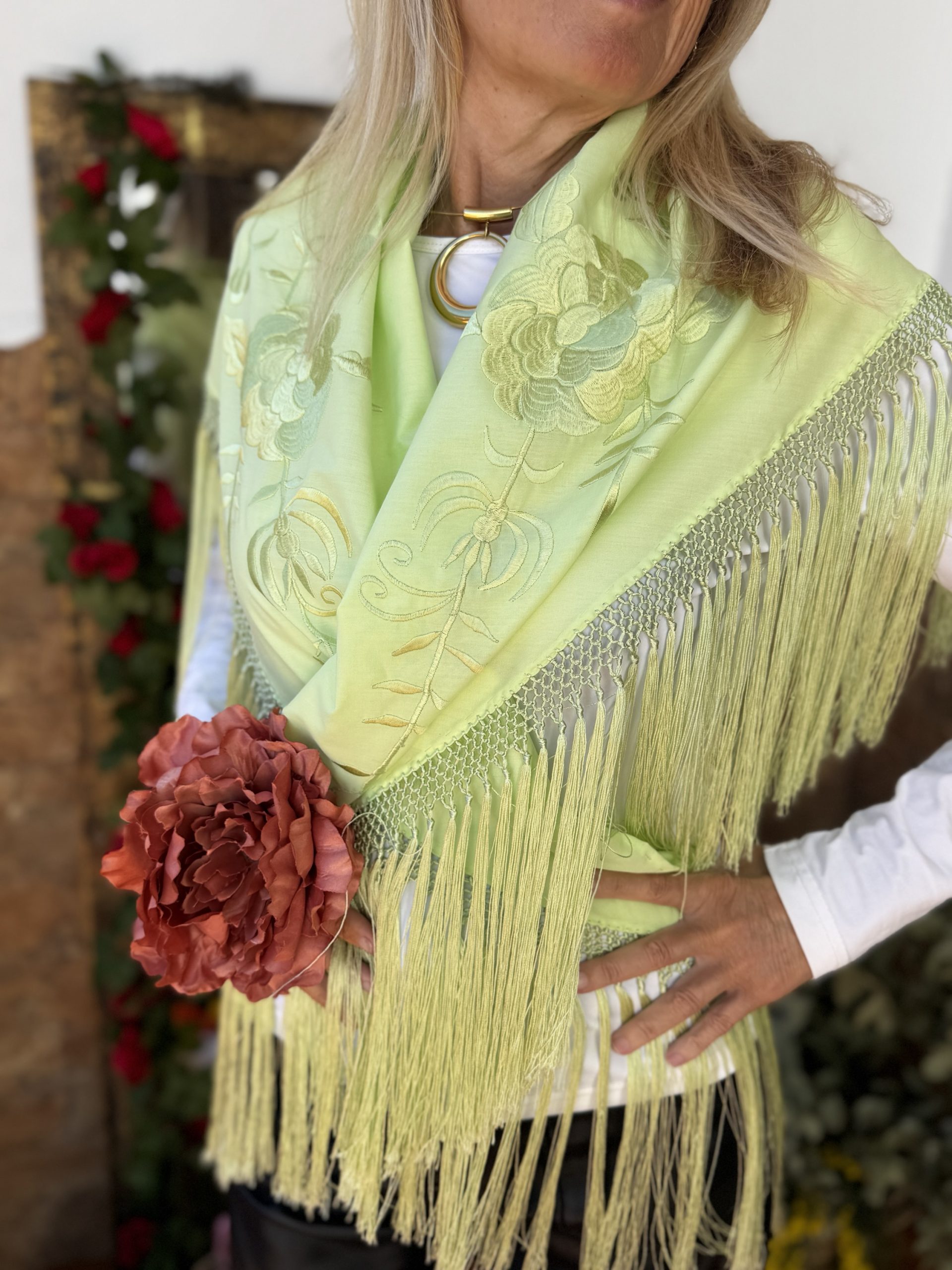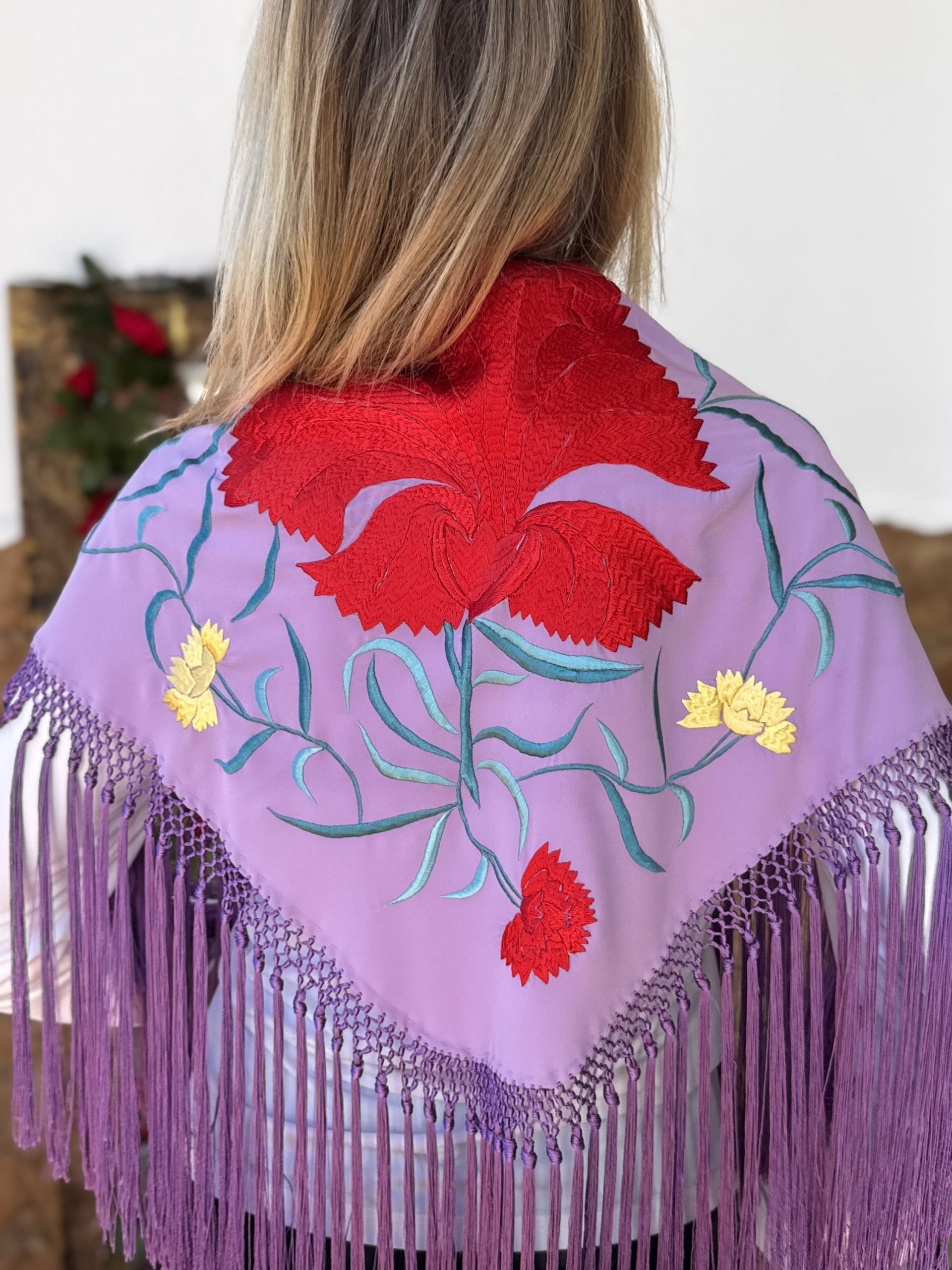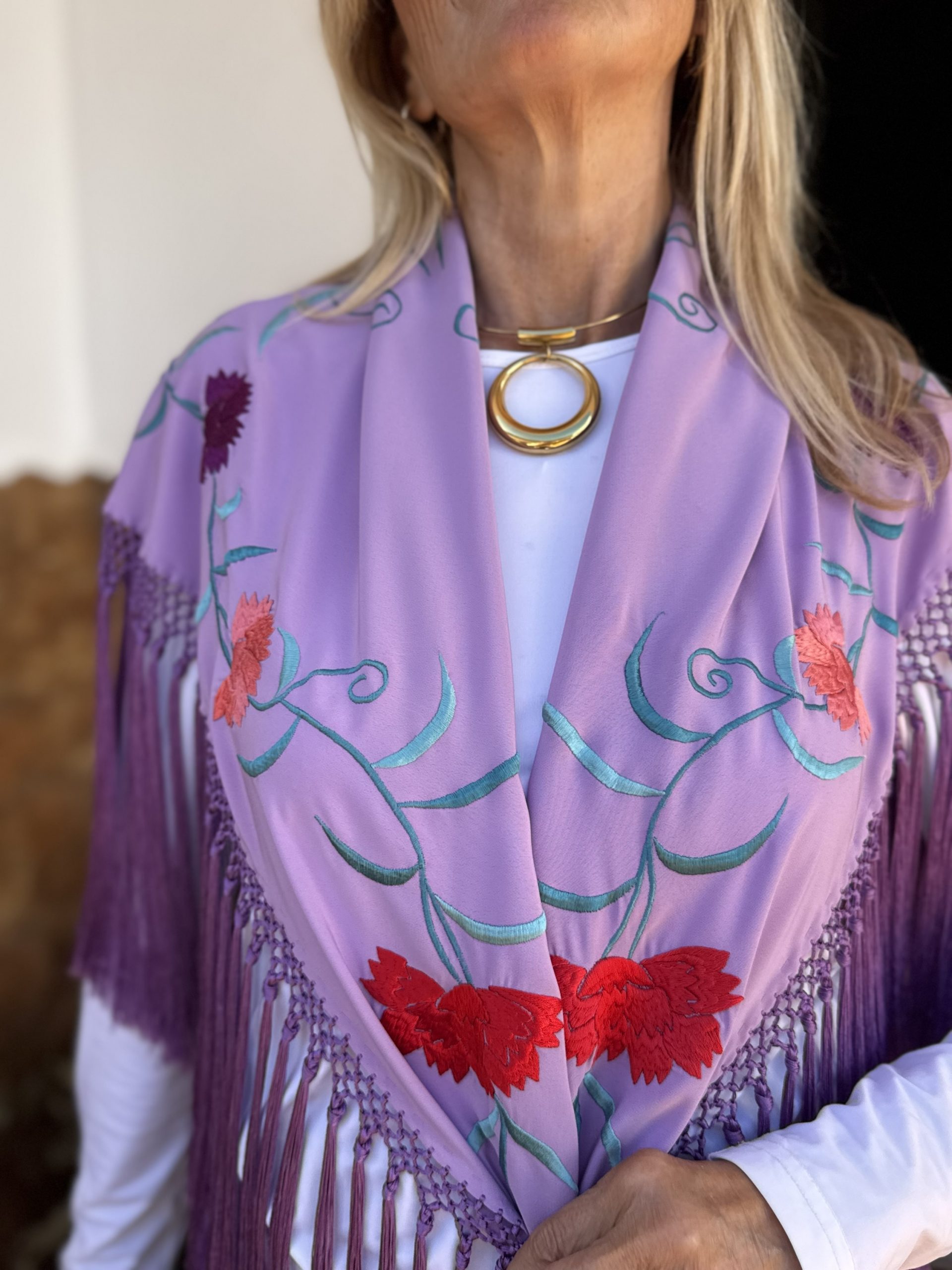 Mantón en tejido de crespón de seda en color malva bordado en colores.