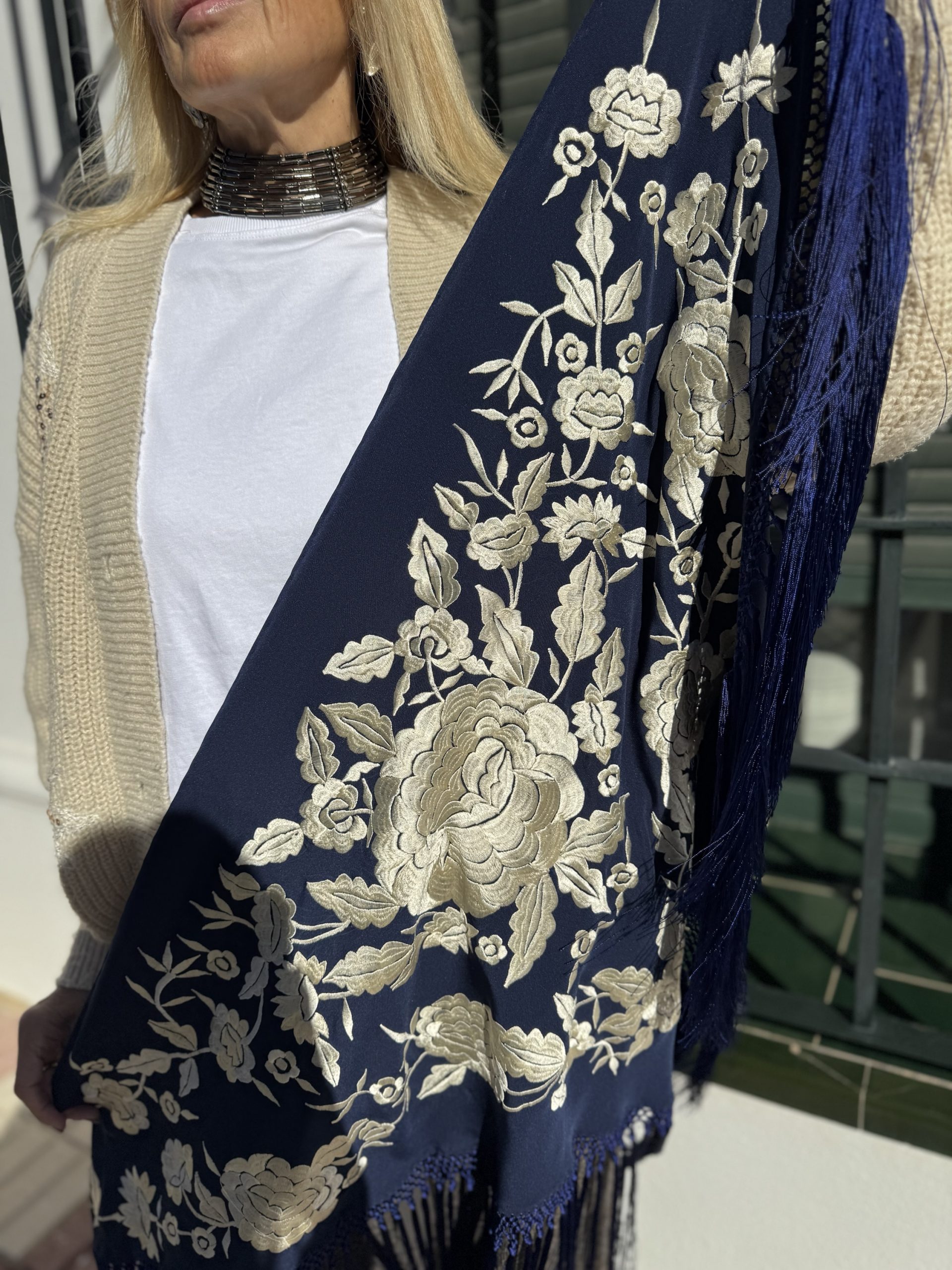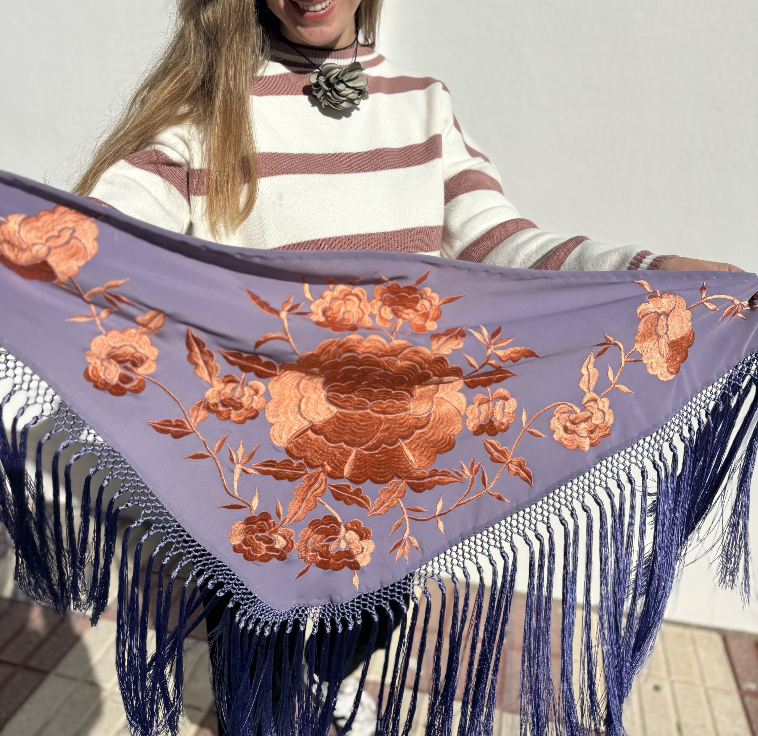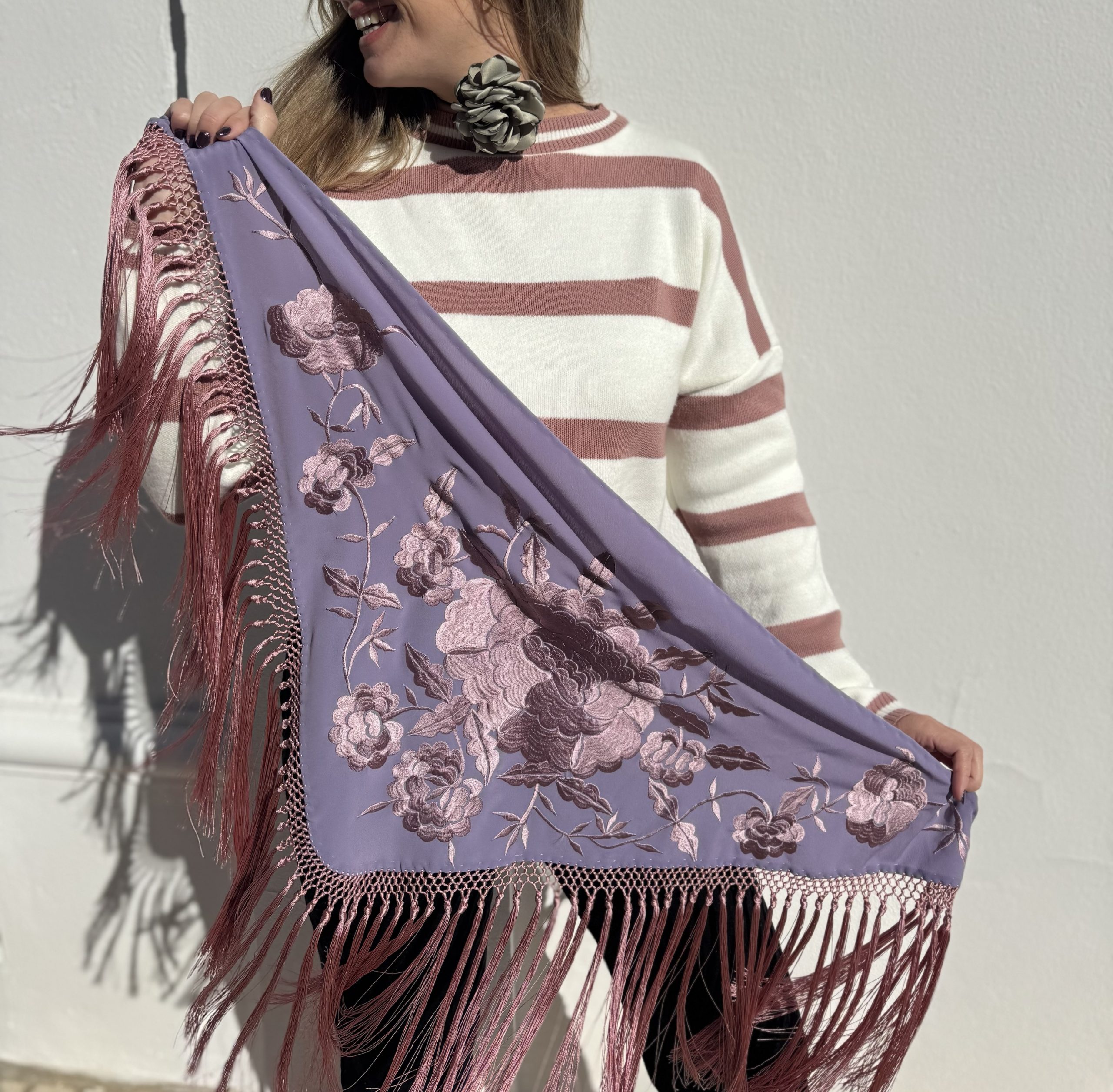 Manton en tejido de crespón de seda en color malva y bordado en color maquillaje con fleco a juego.