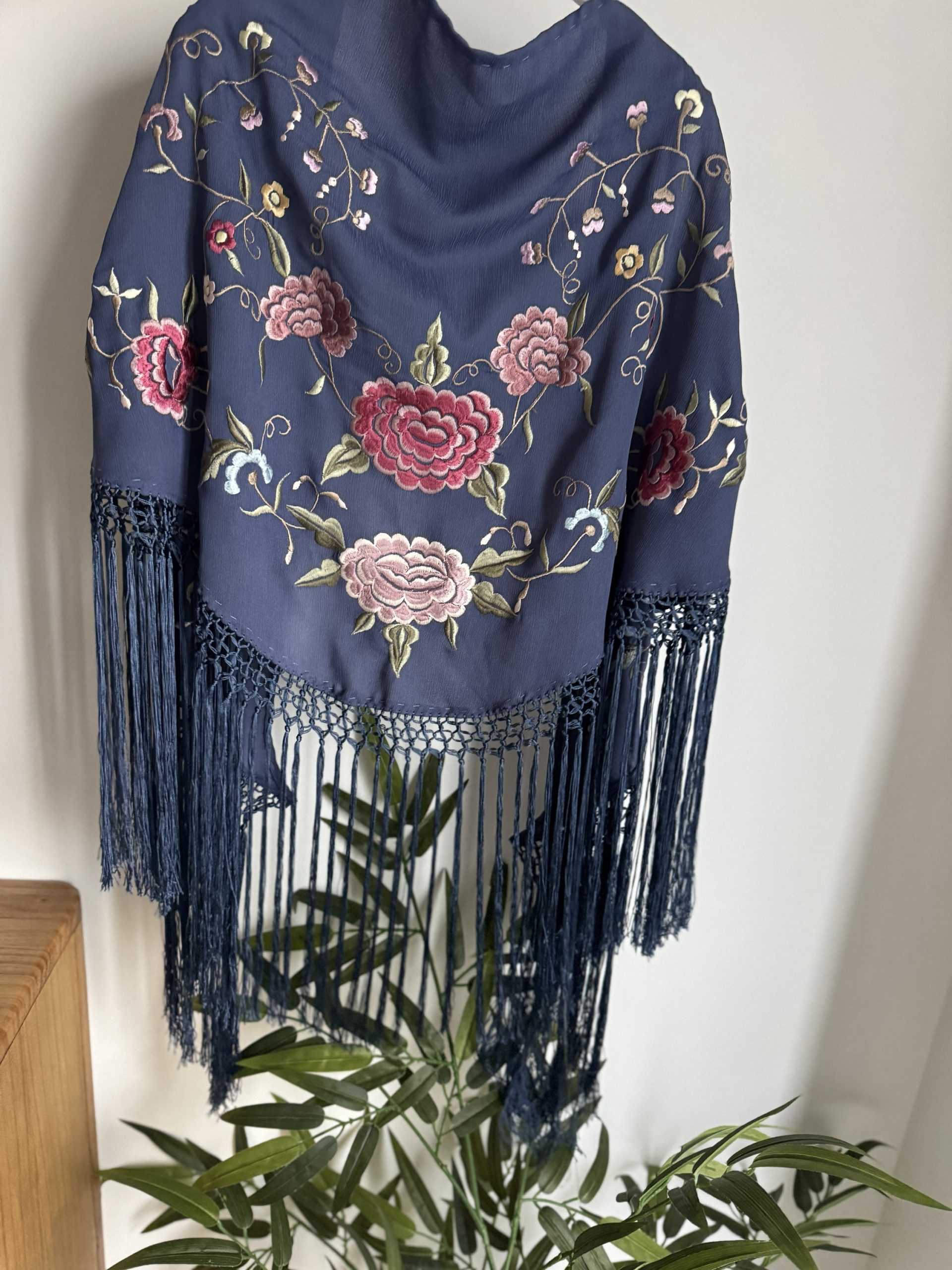 Mantón azul ducado en tejido de gasa muy suave y fresquito, súper cómodo de llevar.