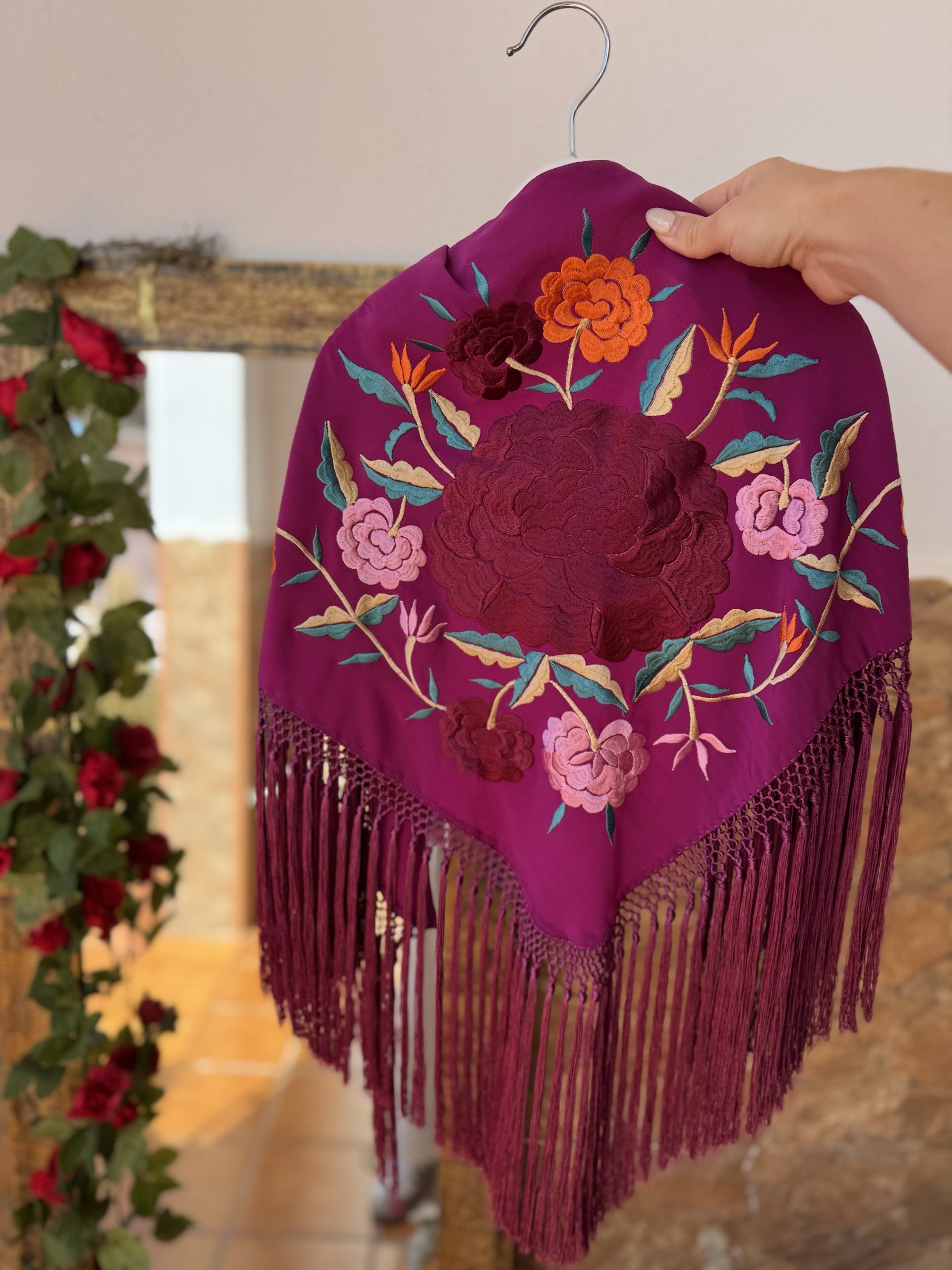 Mantón en tejido de crespón de seda en color buganvilla bordado en colores.