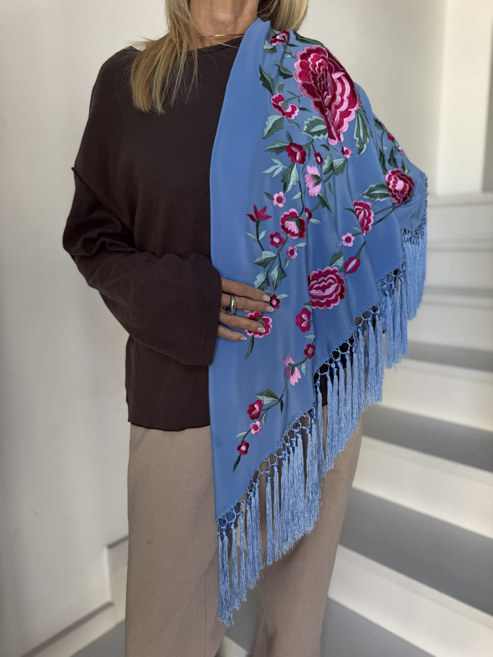 Mantón bordado de forma artesanal en color azul ducado y flores en rosas con una exquisita técnica, en tejido de crespón de seda y enrejado a mano de borlón.