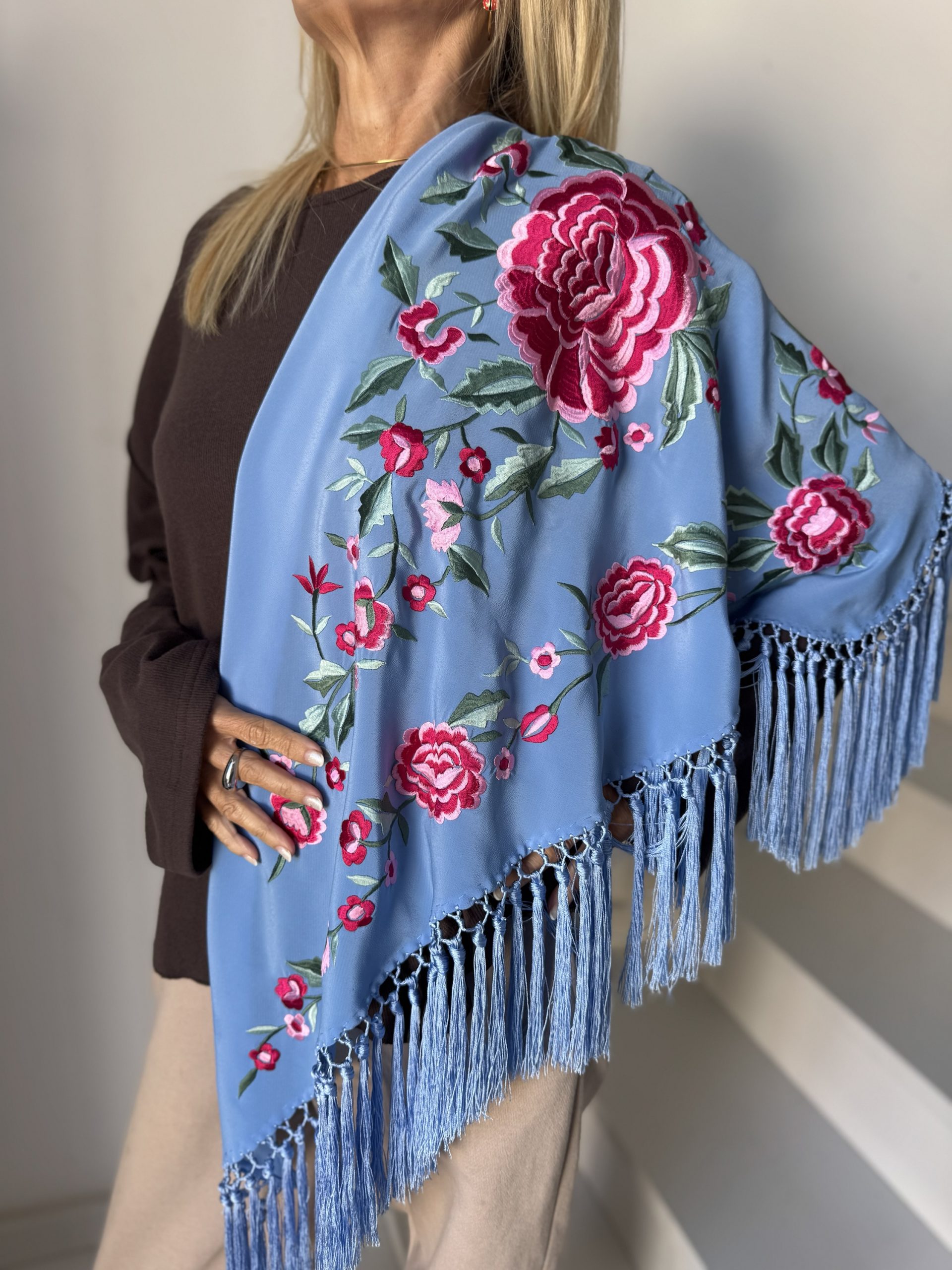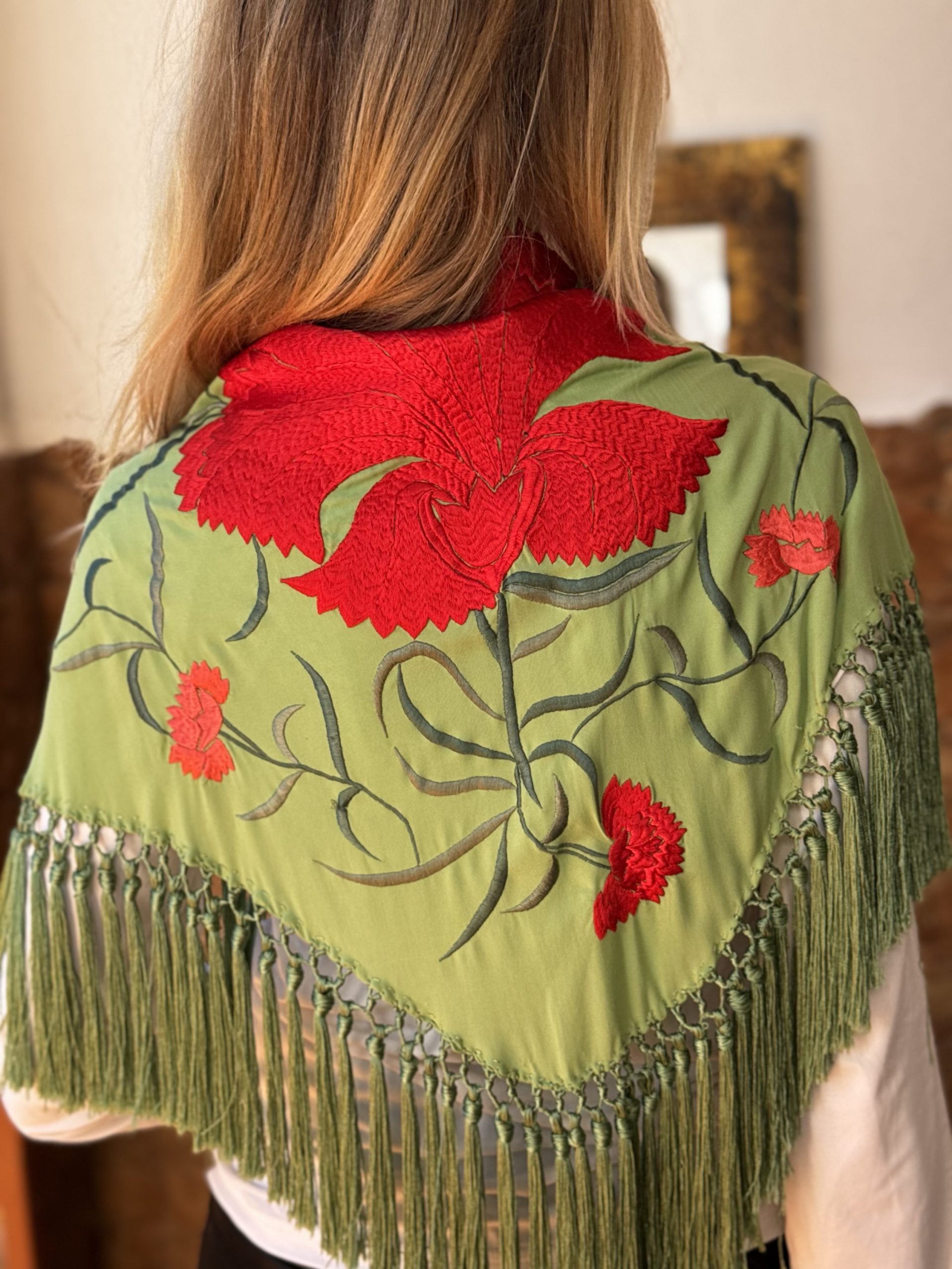 Mantón bordado de forma artesanal con una exquisita técnica, en tejido de Batista de seda y enrejado a mano de borlón.