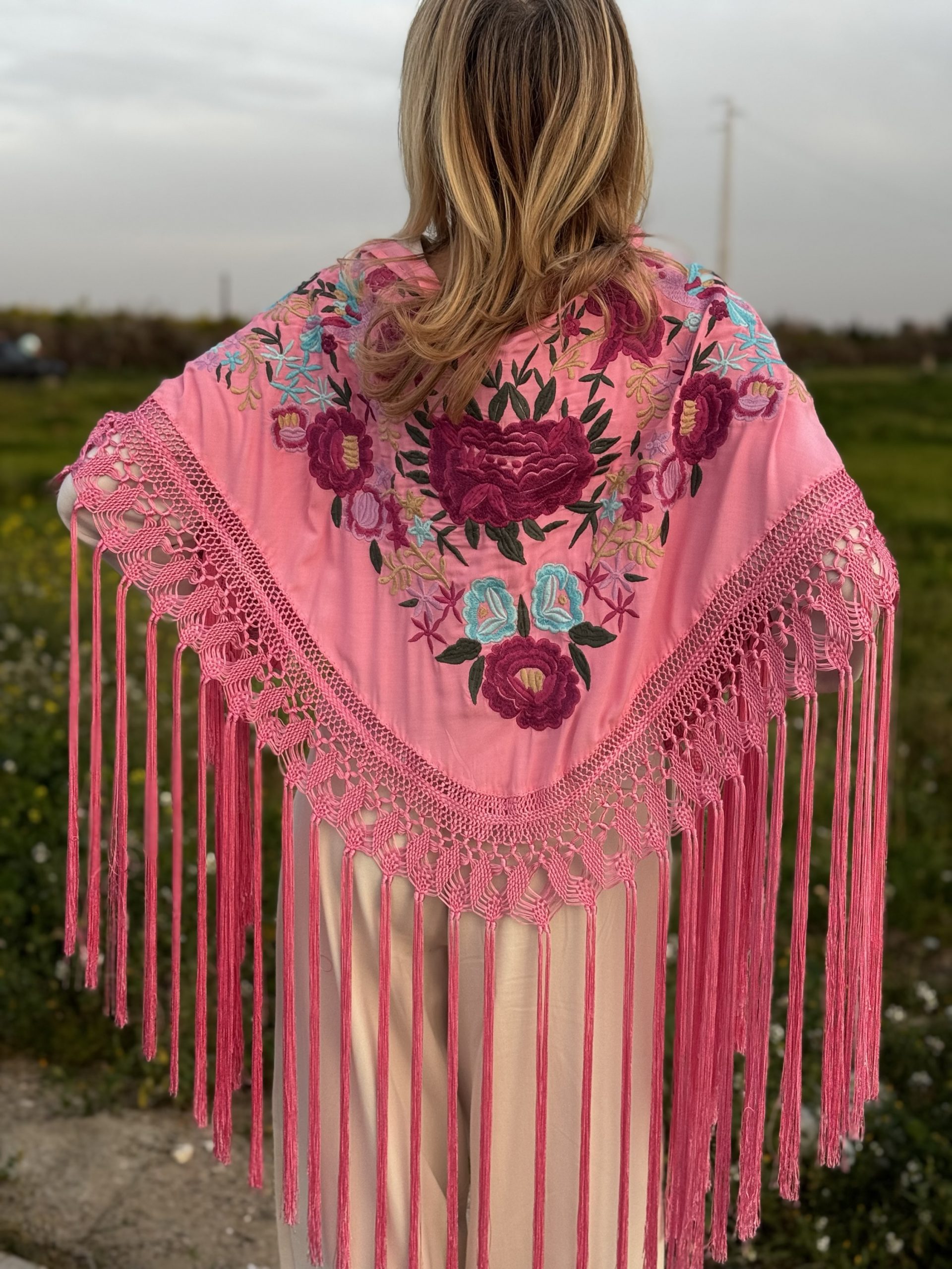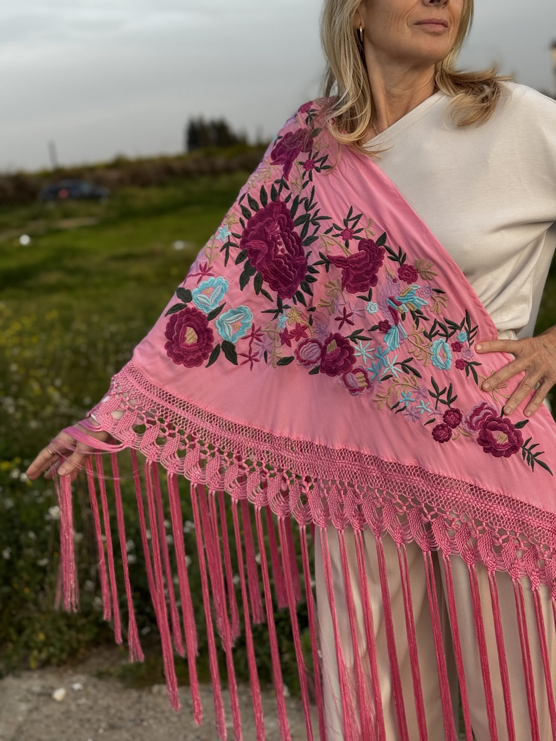 Mantón en tejido de Batista de seda color rosa bordado industrial con enrejado muy elaborado hecho a mano.