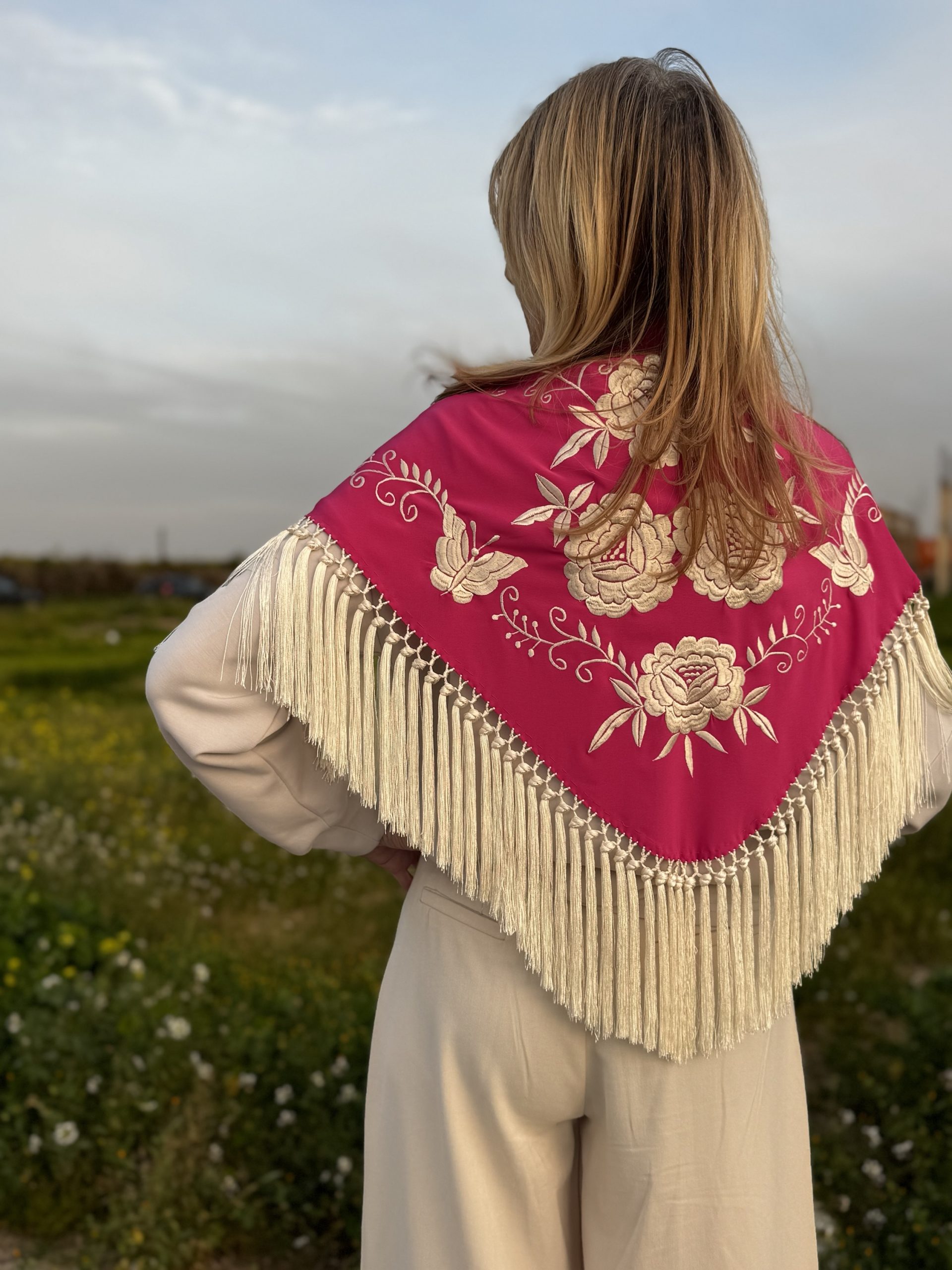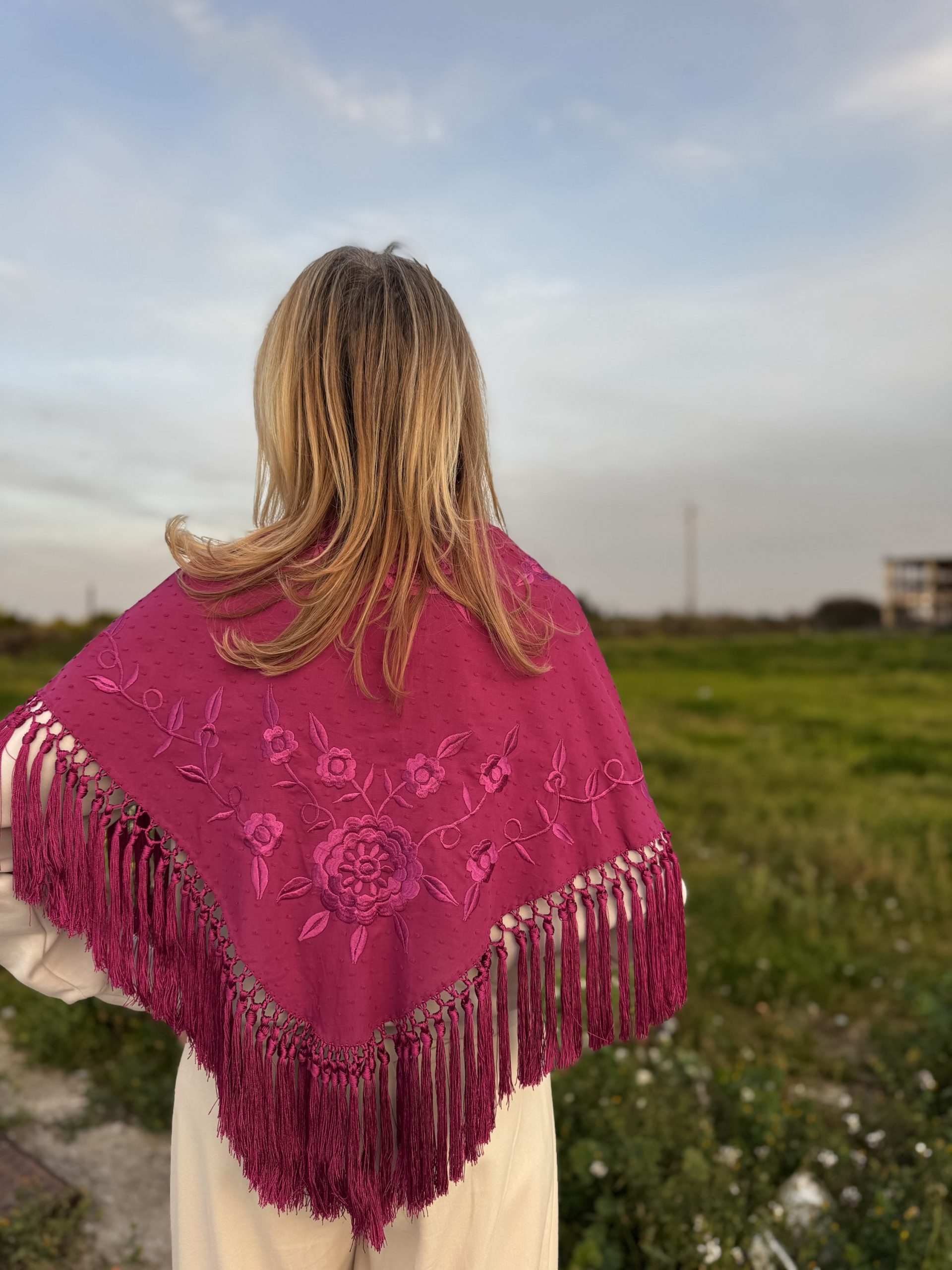 Mantón en tejido de Batista de algodón color fresa bordado en monocolor con flecos de borlón a juego.